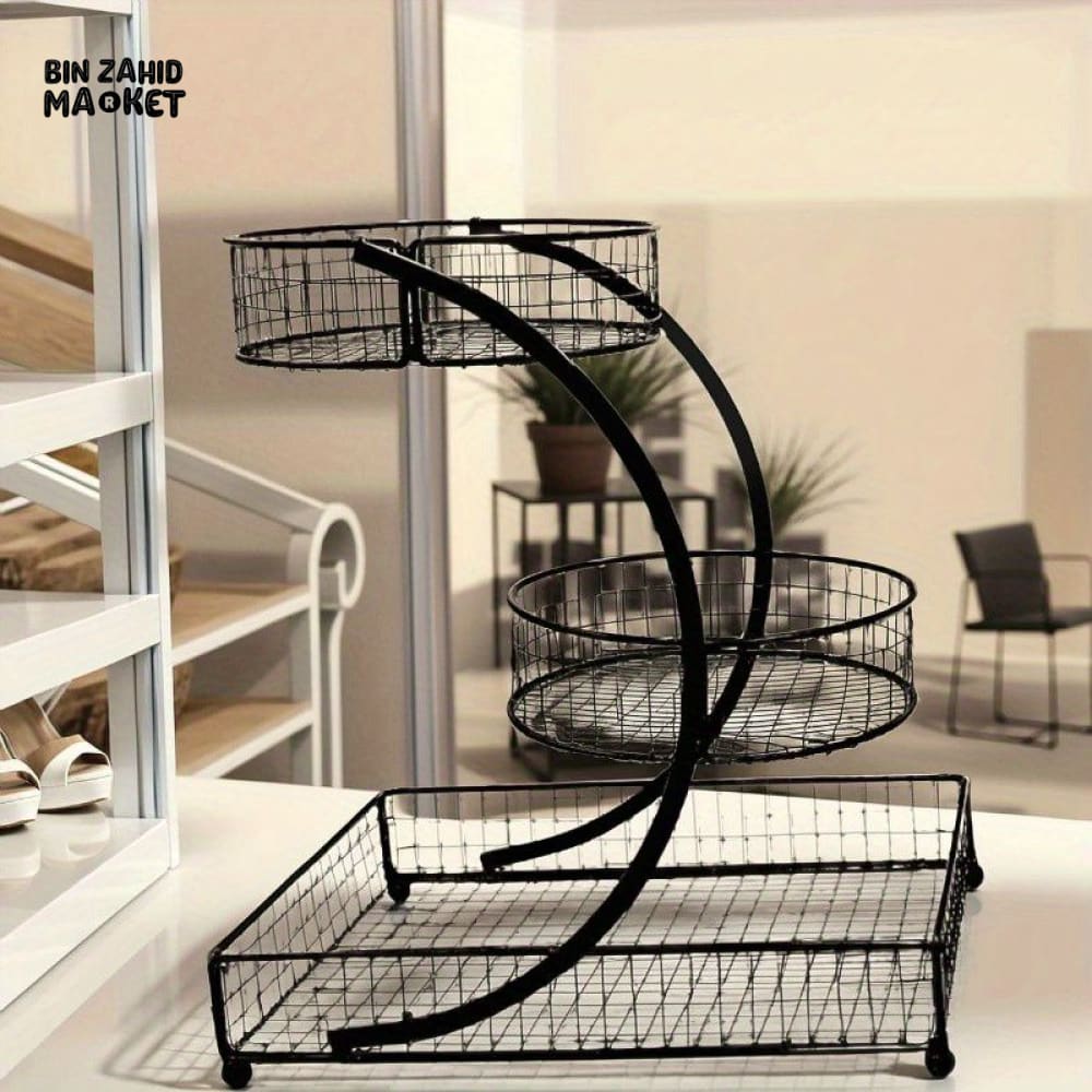 This 3-tier black metal basket stand offers a sturdy and stylish solution for organizing fruits and vegetables on your countertop. Its tiered design maximizes vertical space, keeping produce visible and easily accessible while promoting airflow to maintain freshness. Crafted from durable metal, this display rack combines functionality with a sleek, modern look suitable for any kitchen or market setting. Ideal for those seeking an efficient and elegant way to store and showcase fresh produce.