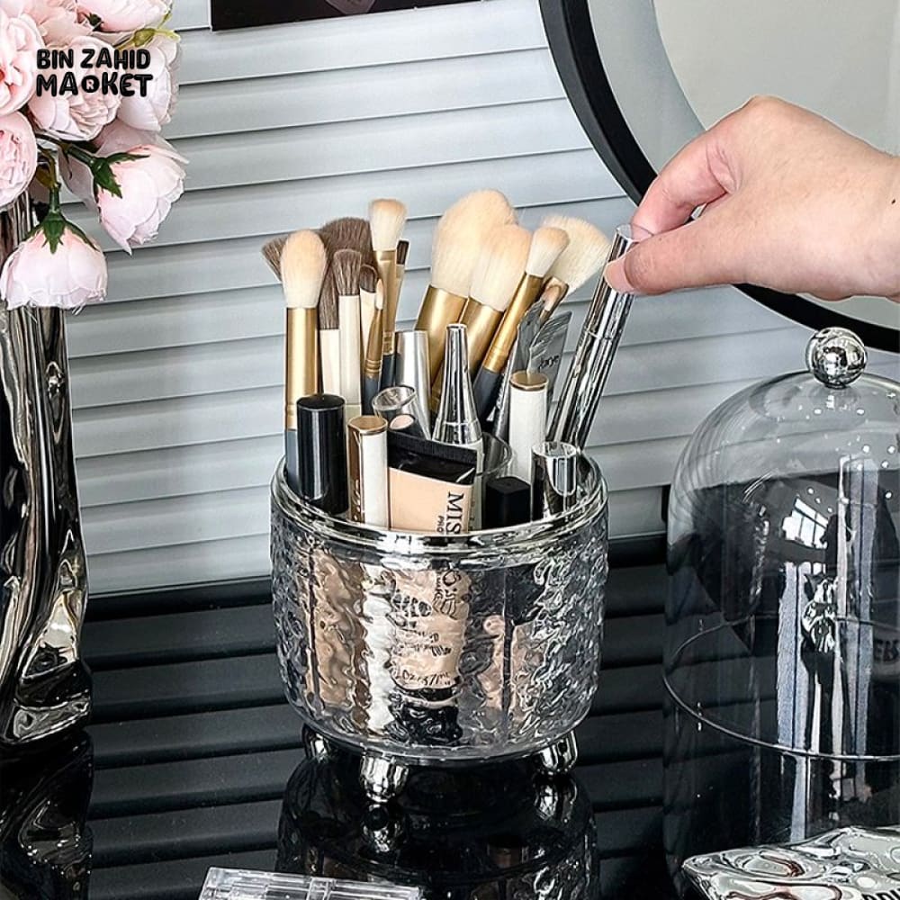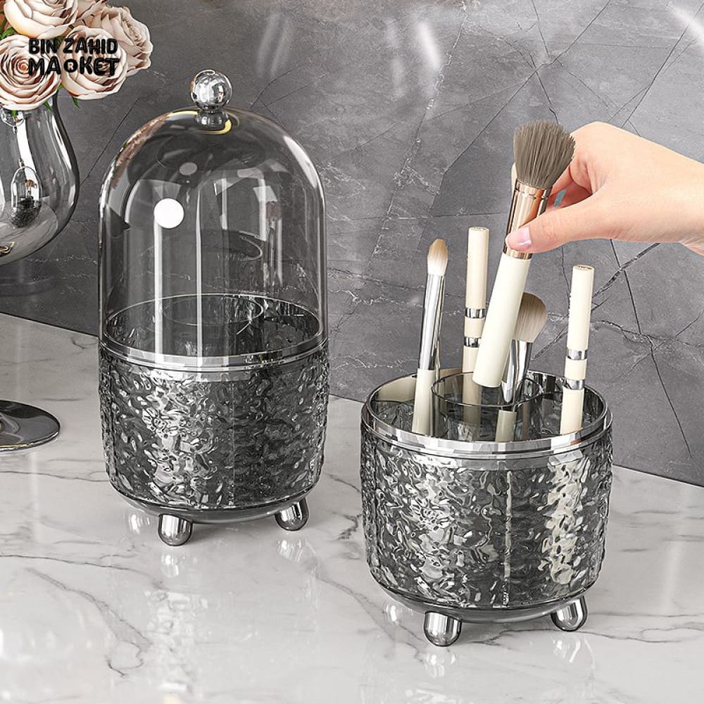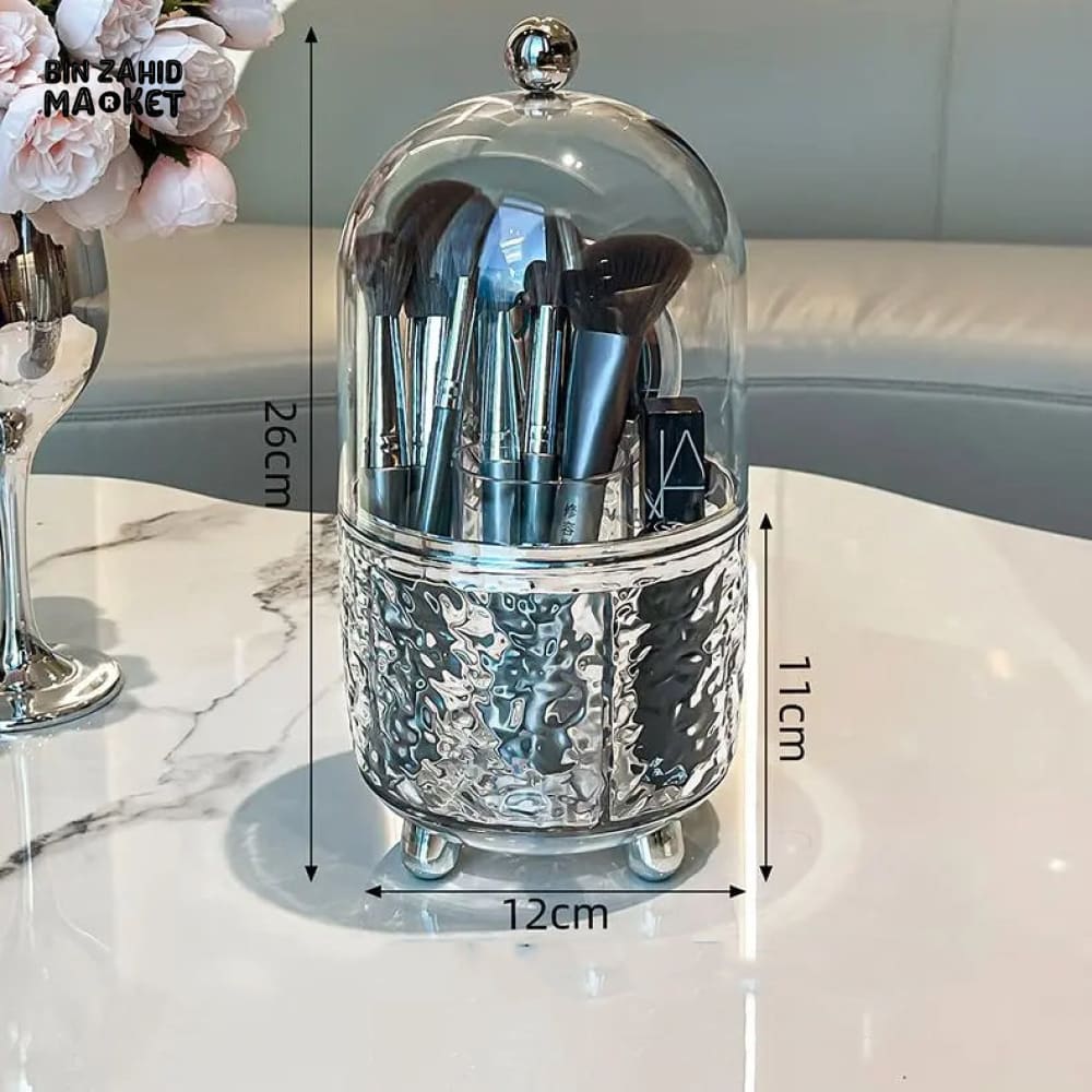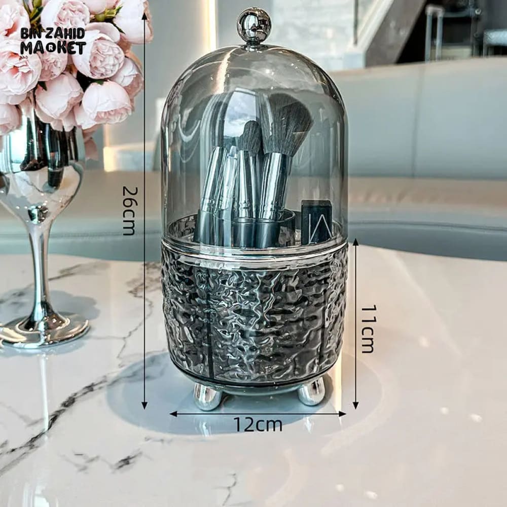 360 rotating makeup brush holder, dustproof cosmetic organizer, luxury dome brush holder, makeup organizer with lid, metallic vanity storage, rotating makeup container, dressing table accessories, covered brush holder, premium cosmetic stand, stylish makeup storage