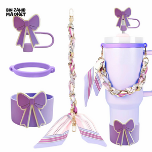 CUTE BOW THERMOS CUP ACCESSORY SET – STRAW COVER SILICONE BAND CHAIN & SCARF DECOR - PURPLE