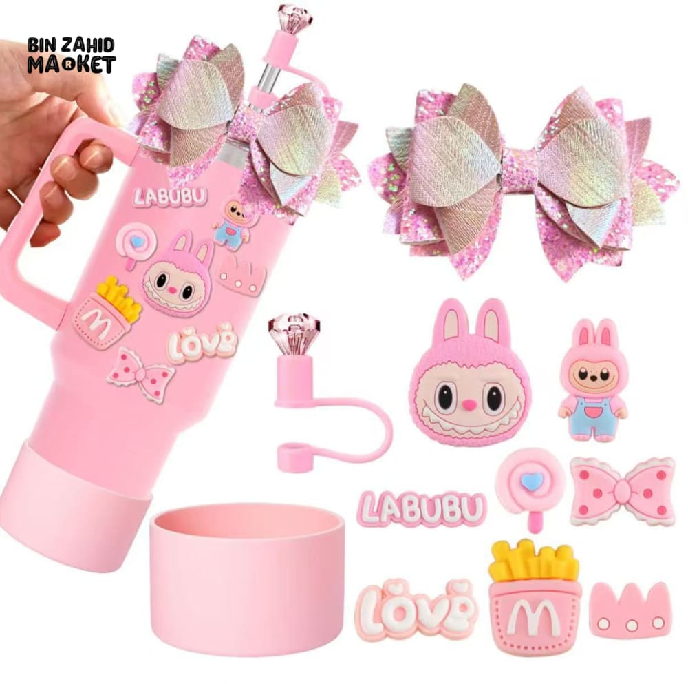 CUTE LABUBU TUMBLER ACCESSORY SET – DECORATIVE STRAW COVER CHARMS BOWS & PROTECTIVE BASE FOR WATER BOTTLES & CUPS - PINK