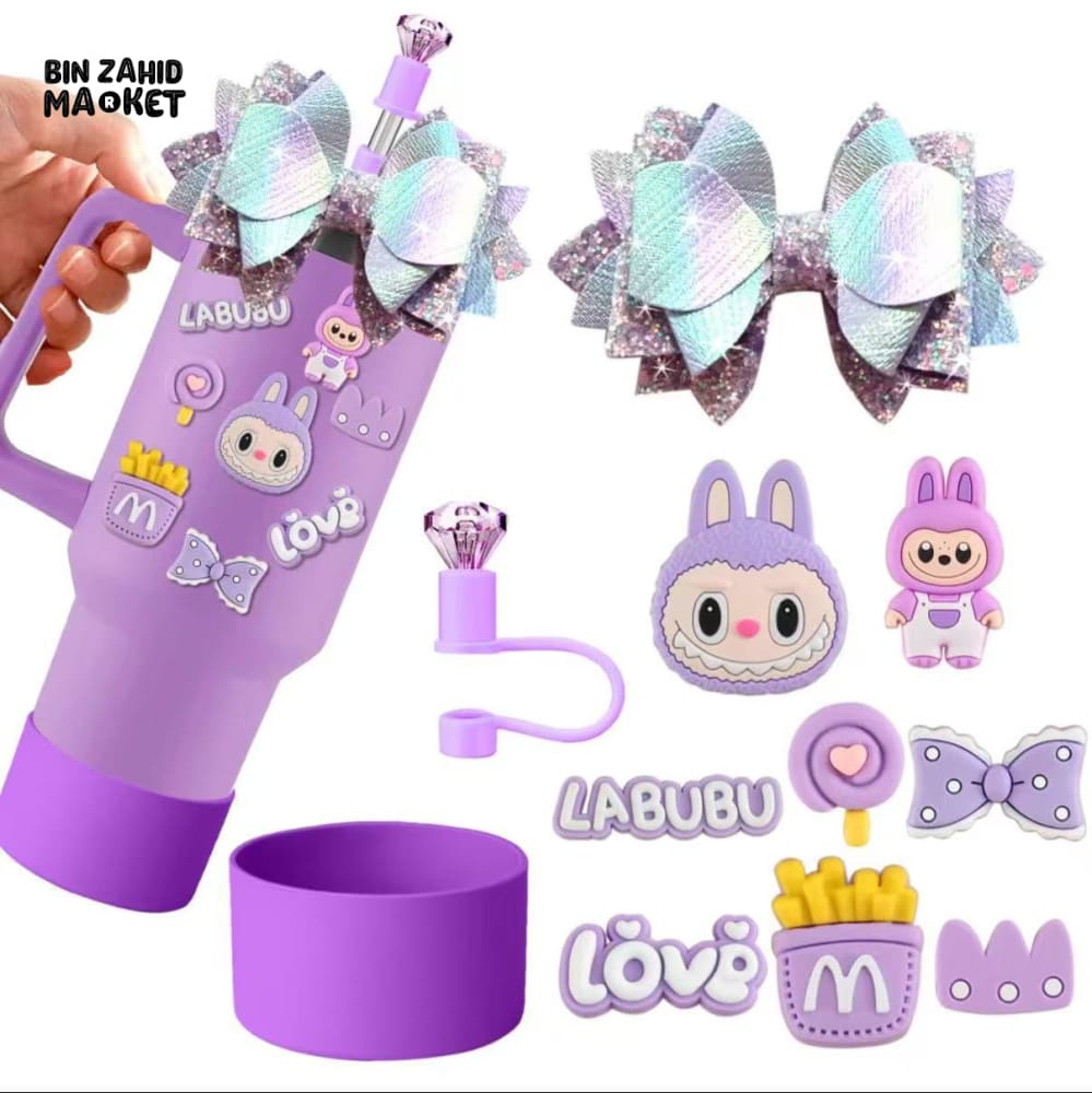 CUTE LABUBU TUMBLER ACCESSORY SET – DECORATIVE STRAW COVER CHARMS BOWS & PROTECTIVE BASE FOR WATER BOTTLES & CUPS - PURPLE