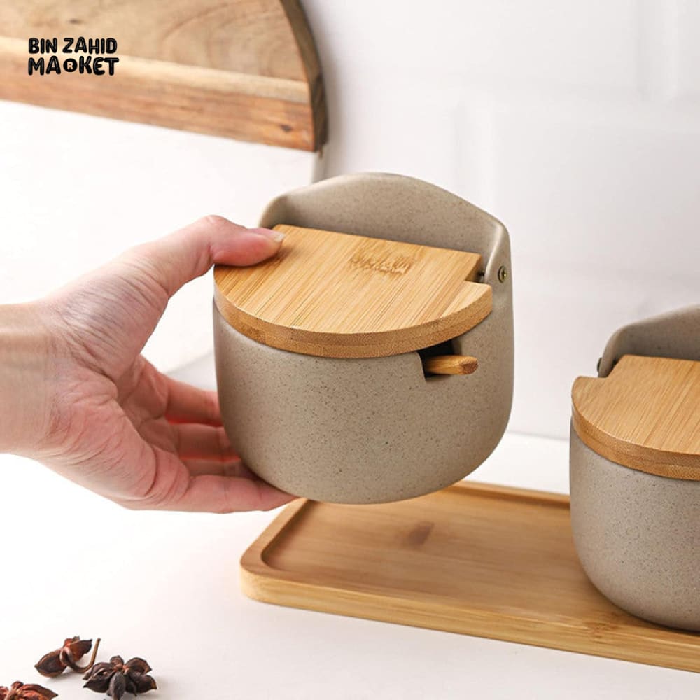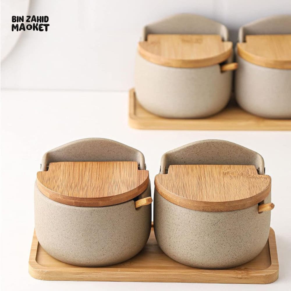 JAPANESE STYLE CERAMIC SPICE JAR SET – 2PIECE WITH WOODEN LIDS, SPOONS & TRAY