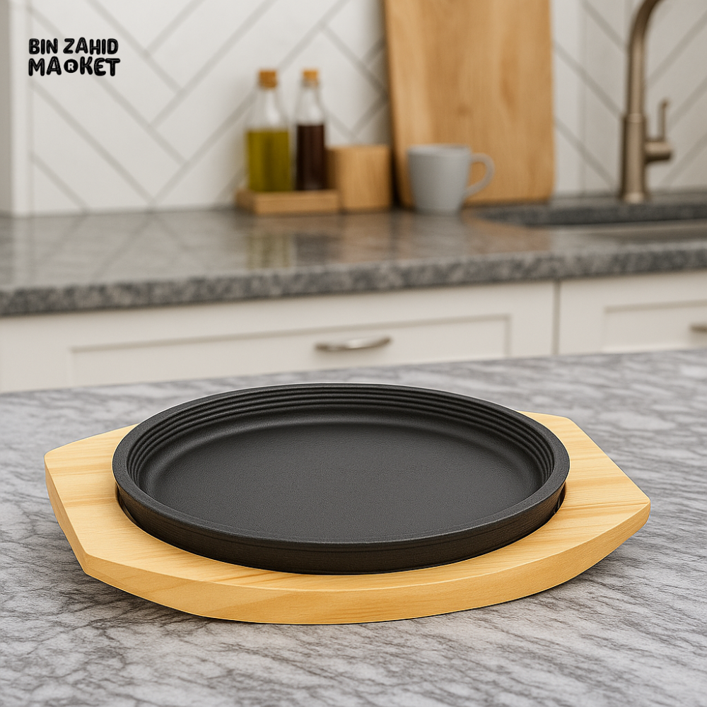 SIZZLER CORNER LINE 20CM PREMIUM CAST IRON STEAK PLATE WITH WOODEN BASE