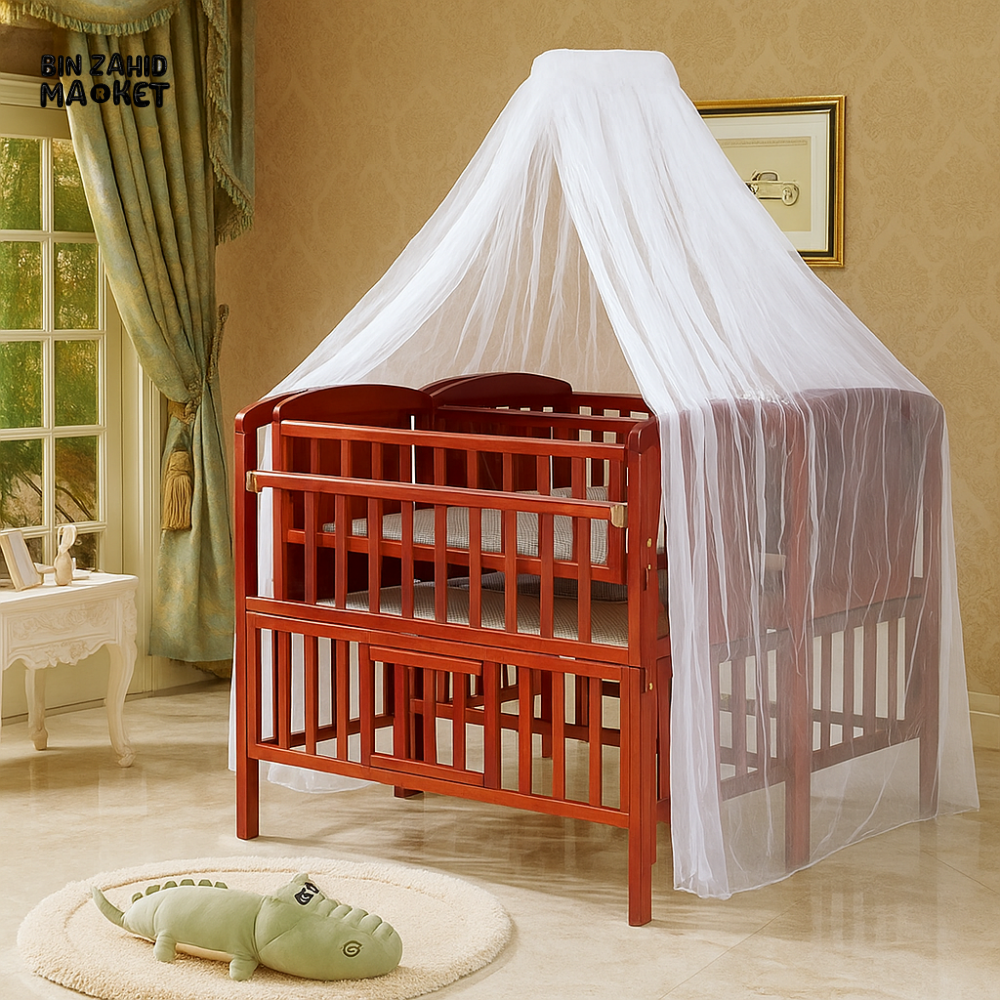 Crafted from premium wood, this luxury baby cot offers a sturdy and elegant sleeping space for your infant. It includes a finely woven mosquito net that provides essential protection against insects, ensuring a safe and comfortable environment. Designed with both durability and style in mind, this cot is an expert choice for parents seeking quality and peace of mind.